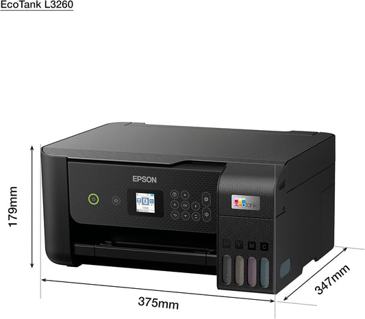 طابعة ايكو تانك L3260 منزلية مقاس ايه 4 وبنظام خزان حبر، طابعة الوان 3 في 1 مع اتصال واي فاي وتوصيل بتطبيق سمارت بانل من ابسون، لون اسود، حقن للحبر