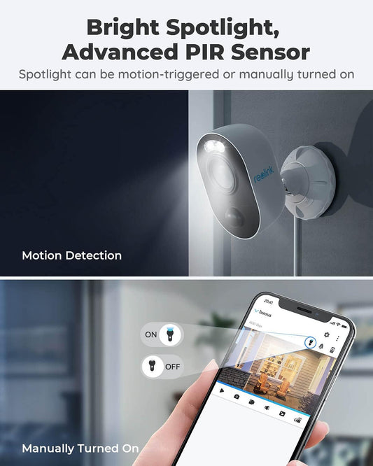كاميرا مراقبة خارجية لاسلكية لوموس مع ضوء كشاف مضادة للماء والغبار بمعيار IP65 بدقة 1080 بي اتش دي مع تقنية كاشف الحركة PIR ونظام تحدث باتجاهين وصفارة انذار مع تخزين على بطاقة مايكرو اس دي من ريولينك